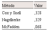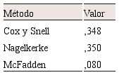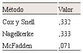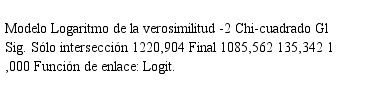 El R2 de Nagelkerke comprueba que la eficacia predictiva de la probabilidad de ocurrencia de las categorías de la variable dependiente es de 33,3%, lo cual indica a su vez que el 66,7% restante viene explicado por las otras variables que no fueron incluidas en el modelo.