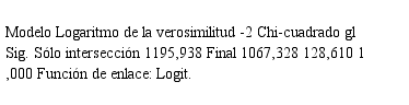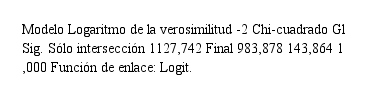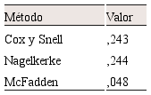 El R2 de Nagelkerke comprueba que la eficacia predictiva de la probabilidad de ocurrencia de las categorías de la variable dependiente es de 24,2% lo cual indica a su vez que el 75,8% restante viene explicado por las otras variables que no fueron incluidas en el modelo.