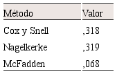 El R2 de Nagelkerke comprueba que la eficacia predictiva de la probabilidad de ocurrencia de las categorías de la variable dependiente es de 31,9% lo cual indica a su vez que el 68,1% restante viene explicado por las otras variables que no fueron incluidas en el modelo.