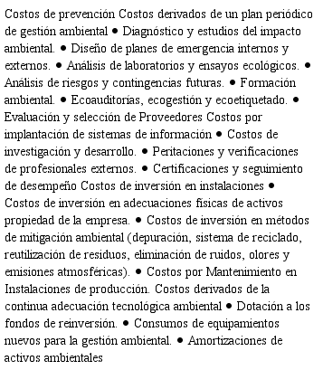 En todo caso estos para poner en práctica estos aspectos, se incurren en costos que reciben el calificativo de costos ambientales: costos de prevención, costos de control ambiental y costos de restauración.