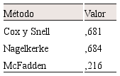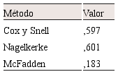 El R2 de Nagelkerke comprueba que la eficacia predictiva de la probabilidad de ocurrencia de las categorías de la variable dependiente es de 68.4%, lo cual indica a su vez que el 31.6% restante viene explicado por las otras variables que no fueron incluidas en el modelo (Tabla 8).