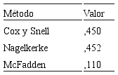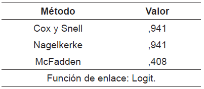 Así. Cox y Snell indica que el índice es de 0.941. Nagelkerke indica que el índice es de 0.941 y McFadden nos indica un índice de 0.408.
