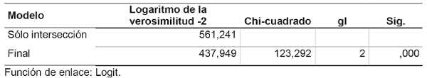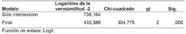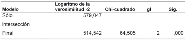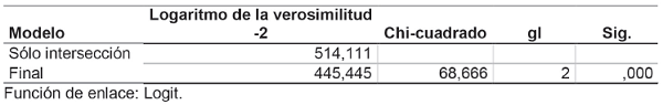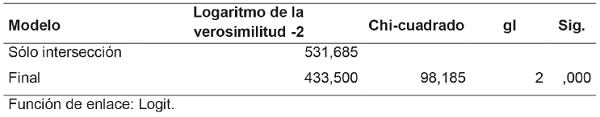 En la Tabla 4, la información de ajuste de los modelos indica que el valor del modelo empírico a la que se aproxima la razón de verosimilitud es de 433,389 con 2 grados de libertad y su significancia es plena (p=0.000), por lo que se rechaza la hipótesis nula en todos los coeficientes del modelo, con una probabilidad de error del 5%.