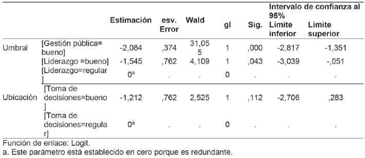 De acuerdo con la Tabla 6, de las estimaciones de parámetro, se puede afirmar que la gestión pública y el liderazgo de la mujer son factores influyentes sobre la toma de decisiones, de acuerdo a la significatividad estadística de 0,000 y 0,043 respectivamente con un grado de libertad y en el nivel bueno.