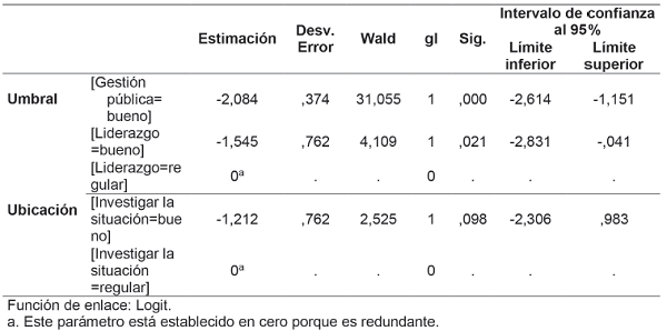 De acuerdo con la Tabla 9, de las estimaciones de parámetro, se puede afirmar que la gestión pública y el liderazgo de la mujer son factores influyentes sobre la situación a investigar, de acuerdo a la significatividad estadística de 0,000 y 0,021 respectivamente con un grado de libertad y en el nivel bueno.
