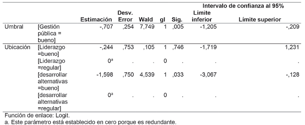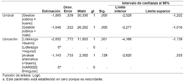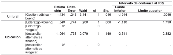 De acuerdo con la Tabla 15, de las estimaciones de parámetro, se puede afirmar que la gestión pública y el liderazgo de la mujer son factores influyentes sobre la dimensión desarrollar alternativas, de acuerdo con la significatividad estadística de 0,005 y 0,746 respectivamente con un grado de libertad y en el nivel bueno.