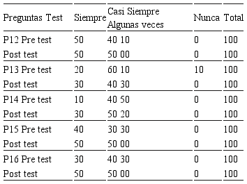 La variación entre pre y pos test es significativo, para el desempeño profesional docente, debido que sus dimensiones: pedagógica, preparación, responsabilidad laboral y cultural, llega a demostrar que existe una diferencia significativa del 9% en la categoría siempre; el cual tiene como sustento que “Una prueba tomada después de un programa, curso, u otros y diseñada para medir su valor o efectividad, generalmente comparando los resultados con los de una prueba tomada antes de tal entrenamiento” (University Oxford, 2016:1).