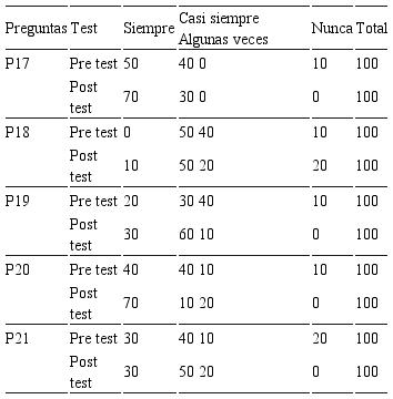 De la misma forma, con la pregunta: 20. ¿En sus sesiones de aprendizaje tiene en cuenta usted, la información de internet? respondiendo casi siempre; además la mayoría de docentes en el pre test, en la categoría nunca, respondieron en un alto porcentaje, y en el post test, respondieron en un menor porcentaje, disminuyendo significativamente. Con estos resultados, hubo cambios entre el pre test y el post test para la muestra de estudio, esto debido a que con el grupo de docentes se trabajó en talleres de capacitación para la utilización de la estrategia del video educativo.