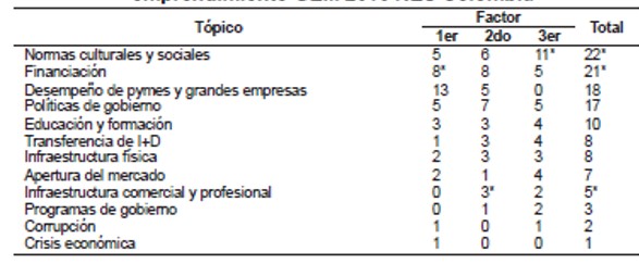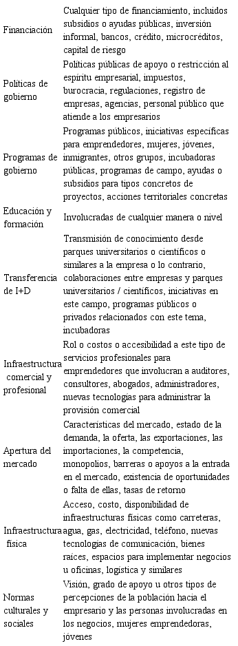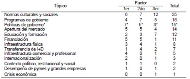 Los factores mencionados por los expertos nacionales como obstáculos al emprendimiento fueron asociados a 12 tópicos: 1) Normas culturales y sociales, 2) Financiación, 3) Desempeño de pymes y grandes empresas, 4) Políticas de gobierno, 5) Educación y formación, 6) Transferencia de I+D, 7) Infraestructura física, 8) Apertura del mercado, 9) Infraestructura comercial y profesional, 10) Programas de gobierno, 11) Corrupción y 12) Crisis económica.