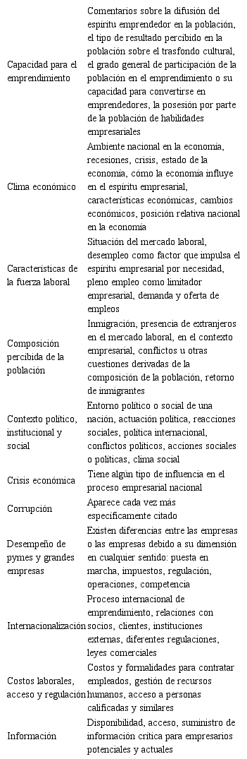 Los factores mencionados por los expertos nacionales como impulsores del emprendimiento fueron asociados a 13 tópicos: 1) Normas culturales y sociales, 2) Programas de gobierno, 3) Políticas de gobierno, 4) Apertura del mercado, 5) Educación y formación, 6) Financiación, 7) Infraestructura física, 8) Transferencia de I+D, 9) Infraestructura comercial y profesional, 10) Internacionalización, 11) Contexto político, institucional y social, 12) Desempeño de pymes y grandes empresas y 13) Crisis económica.