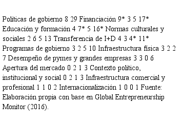 El emprendimiento por décadas se ha considerado como un fenómeno que de la mano de quien lo ejerce (emprendedores), pueden lograr niveles de desarrollo para las sociedades y las naciones del mundo. Es necesario emprender y desarrollar ideas novedosas que impulsen la creación de empresas y negocios innovadores cuyo potencial sea propicio para crear ventajas distintivas tanto para las regiones como para el mundo. Por estos argumentos, los formuladores de políticas, deben estar al tanto en conocer tópicos críticos y favorables, así como aquellos para los cuales los expertos nacionales formulan más sugerencias, es decir los que se asumen como obstáculos en la labor gerenciar que asumen emprendedores del mundo.