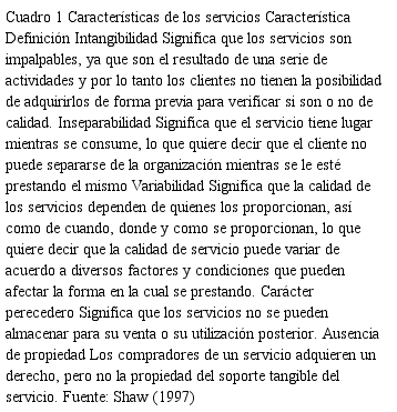 Van Bon (2008) lo define como un medio para entregar valor a los clientes facilitando los resultados que estos esperan conseguir. De tal manera que el servicio es un conjunto de actividades interrelacionadas que ofrece un suministrador con el fin de que el cliente obtenga un beneficio en el momento y lugar adecuado. De esta manera puede afirmarse que el servicio no es más que todas las características que debe poseer el mismo con el fin de que éste quede satisfecho y su necesidad sea cubierta totalmente. Shaw (1997) considera que los servicios poseen las características que se presentan en el cuadro 1.