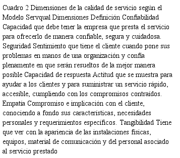 Este modelo inicialmente consideró diez dimensiones obtenidas de estudiosde la calidad en diversos tipos de servicio, posteriormente se agruparon algunas de las dimensiones anteriores de acuerdo a su similitud, resultando los cinco elementos de la calidad que se presentan en el cuadro 2.