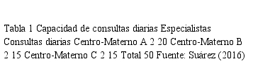 Posteriormente se consultó al personal administrativo de los centros de salud sobre la cantidad de médicos tratantes y el número de consultas, informando los mismos que se tienen dos (2) especialistas y que se programan entre 15 y 20 consultas diarias en cada uno, tal como se expone en la tabla 1, siendo las usuarias atendidas de lunes a viernes en horario de 8:00 am a 12:00 pm.