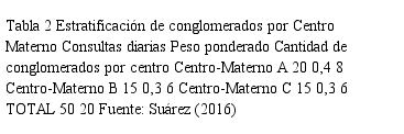 Posteriormente, se realizó una estratificación a fin de distribuir proporcionalmente los conglomerados. Para esto, se tomó como base la cantidad de consultas ofrecidas por día y se calculó un peso, el cual se utilizó para hallar la cantidad de conglomerados a contemplar en cada centro materno-pediátrico, tal como se muestra en la tabla 2.