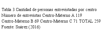 La investigación se realizó a través de un muestreo por conglomerado el cual consiste en seleccionar de una población, en forma aleatoria, un conjunto de m-colecciones de elementos muestrales y posteriormente efectuar un censo en cada uno de los conglomerados seleccionados (Parra, 2003). En la presente investigación se estableció como conglomerado cada uno de los días en que los Centros Materno-Pediátricos prestan el servicio de consulta prenatal, siendo los elementos muestrales el grupo de todas las pacientes que acuden a recibirla. Para calcular el número de conglomerados se tomaron en cuenta variables como presupuesto, tiempo, personal disponible, materiales, ubicación geográfica y transporte a fin de determinar la capacidad del entrevistador, quedando el número fijado a 300 entrevistas para el proceso de recolección.