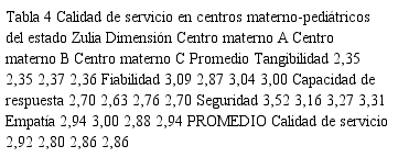Una vez analizadas cada una de las dimensiones consideradas para evaluar la calidad del servicio de los centros materno-pediátricos del estado Zulia, la tabla 4 resume los resultados obtenidos.