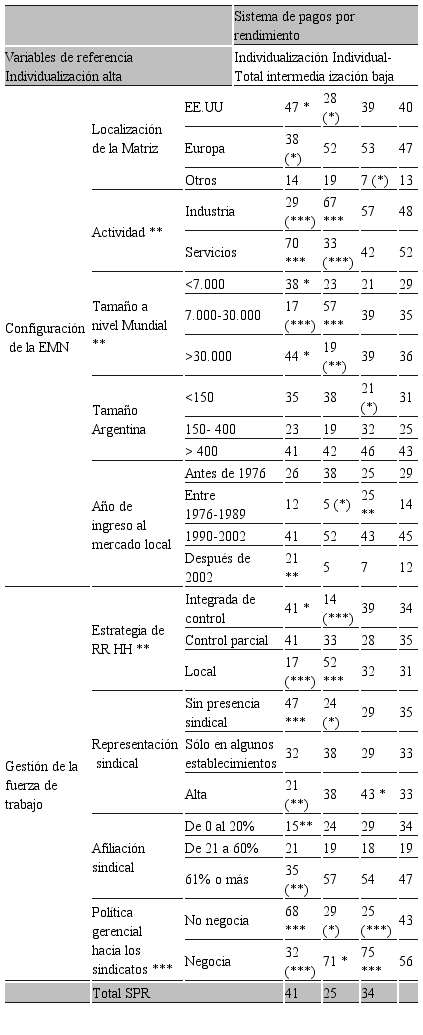 Abstract: In recent years, new forms of workforce management implemented pay-for- performance systems (PPS) as a form of salary individualization. The main objective of the article is to establish the use of PPS in multinational companies (MNC) of Argentina and its association with different characteristics of the company and the unions. A quantitative analysis was carried out based on surveys conducted in 2016 to MNC subsidiaries. Contingency tables were prepared to test the existence and statistical significance of the association between selected variables. The results indicate a significant positive association between SPR of high individualization and the categories: American origin, service sector, large and small world size, entry to the country after 2002, subsidiaries controlled by the headquarter, absence of union representation, low rates of union membership and non-negotiating policy with the unions. It is concluded that, faced with the advancements of the individualizing SPRs, the unions face the challenge of negotiating the best conditions for the incorporation of these strategies in favor of their workers.