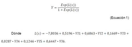 El valor más importante es el estadístico Chi^2 asociado al Log Ratio (L.R.), esto es el equivalente de la prueba F de Fisher del modelo lineal; en este caso se desea evaluar si las variables independientes VD1, VD2, VD3, VD4, VD5 y VD6 proporcionan una cantidad de información significativa para explicar la variable binaria VD. En este caso, como la probabilidad es inferior a 0.0001, se puede deducir que las variables proporcionan una cantidad significativa de información. La última etapa reside en la aplicación del modelo ajustado. En este caso el modelo se escribe: