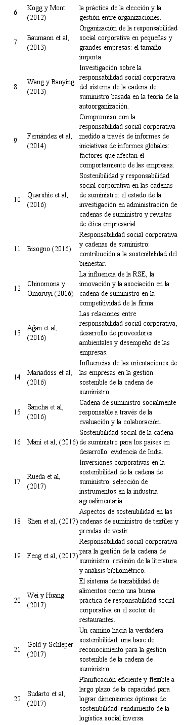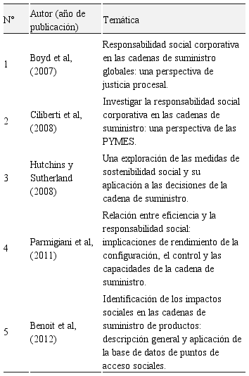 La selección de los artículos obtenidos en el proceso de búsqueda anterior se llevó a cabo considerando dos criterios de inclusión: (i) el artículo presenta un aporte teórico sobre aspectos básicos de RSCS, y, (ii) el artículo presenta un esquema general de aplicación de prácticas de RSCS en casos reales. Análogamente, se excluyeron del estudio los artículos que cumplieron alguno de los siguientes criterios de exclusión: (i) el artículo presenta un aporte sobre responsabilidad social empresarial sin considerar el contexto de las cadenas de suministro, y (ii) el artículo presenta aporte sobre cadenas de suministro sin considerar la responsabilidad social, económica o ambiental.