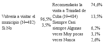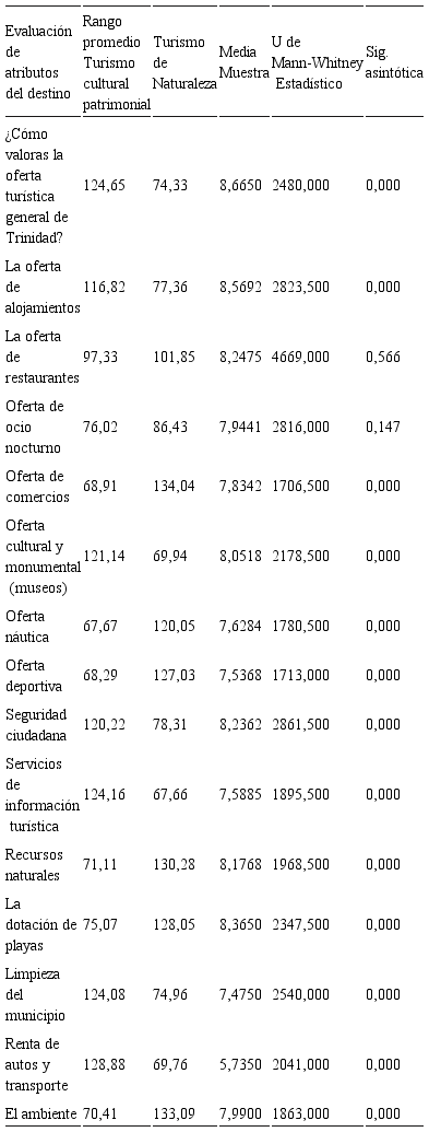Los turistas no siempre asignan la misma importancia a los atributos del producto, por lo que es crucial entender los factores que influyen en el comportamiento del turista y qué elementos particulares consideran los turistas como importantes. De acuerdo a los perfiles de la demanda que visita el destino Trinidad de Cuba, se pudo corroborar que existen diferencias significativas en cuanto a la valoración y evaluación, que hacen del destino en su conjunto, como en sus atributos; los visitantes agrupados en el turismo cultural patrimonial hacen una mejor valoración general del destino en su conjunto (99% regresaría y un 98% recomienda el destino), destacando el valor que le dan a los alojamientos, la oferta cultural y monumental, la seguridad ciudadana, la información turística, limpieza del municipio y renta de autos y transporte. Sin embargo los visitantes identificados en el grupo de turismo de naturaleza emiten una valoración menos satisfactoria del destino (un 14% nunca regresaría y un 3.4% no lo recomienda), aunque valoran mejor su oferta de restaurantes, ocio nocturno, comercios, náutica, deportiva, recursos naturales, la dotación de playas, y el ambiente.