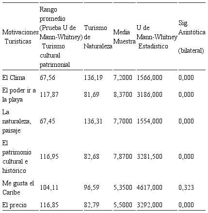 De igual manera se encuentran diferencias significativas en las motivaciones del viaje, el clúster Turismo cultural patrimonial prefiere la playa, el patrimonio cultural e histórico, el Caribe, el precio y la tranquilidad; mientras que para el Turismo de Naturaleza lo es el clima, la restauración, el ocio nocturno, la naturaleza y el paisaje. Enmarcadas son las diferencias en la relación con el producto o servicio, el clúster cultural identifica clientes que se alojan en hoteles, con estancias de 3 a 6 noches, que hacen la reserva directamente pues la mayoría han visitado el destino anteriormente; el clúster naturaleza se alojan mayoritariamente en Hostales, con una duración de 1 a 2 noches y la mayoría reserva a través de una agencia de viaje pues por lo general nunca han visitado Trinidad.