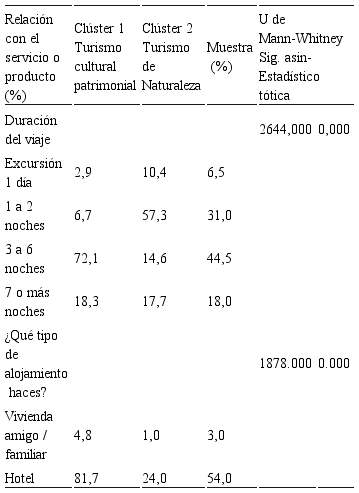 Se identificaron los perfiles de clientes para cada uno de los dos segmentos identificados; se utilizan las tablas de contingencias entre variables de interés (Garcia & Gallard, 2002) que permite relacionarlas pues conocer las características de cada uno es sumamente importante para poder identificar las mejores estrategias. La relación con el servicio o producto de los conglomerados obtenidos, sobre la base de la muestra total, (ver tablas 6), se aplicaron una serie de pruebas de U de Mann-Whitney para investigar si hubo diferencias estadísticas entre las variables de comportamiento turístico de cada grupo que visitó Trinidad de Cuba.