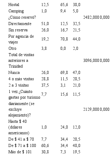 A partir de su análisis, se puede concluir que existen diferencias (p <0.05) en la composición de los grupos en relación con el Duración del viaje (p <0.000), ¿Qué tipo de alojamiento haces? (p <0.000), ¿Cómo reservó? (p <0.000), total de visitas anteriores a Trinidad (p <0,000) y ¿Cuánto gastas por concepto de turismo diariamente (se excluye alojamiento)? (p <0,000).