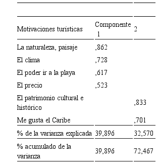 Esta investigación en segundo lugar aplica un análisis de componentes principales (ACP) con rotación varimax, como la elección adecuada entre los métodos de estimación del análisis factorial exploratorio (AFE). Este análisis se aplicó a trece ítems para medir las dimensiones de motivación que subyacen en la elección de los turistas de las actividades turísticas. Este estudio utilizó los criterios sugeridos por (Park & Yoon, 2009:102): (1) carga del factor igual o superior a 0.50, (2) valores propios iguales o superiores a 1.0, y (3) los resultados del análisis factorial explican al menos el 72,46% de la varianza total (tabla 4). Se descartaron todos aquellos ítems que mostraban correlaciones muy débiles, inferiores a 0,3 (Cea, 2002; De Vaus, 2002 y Brida et al, 2012).