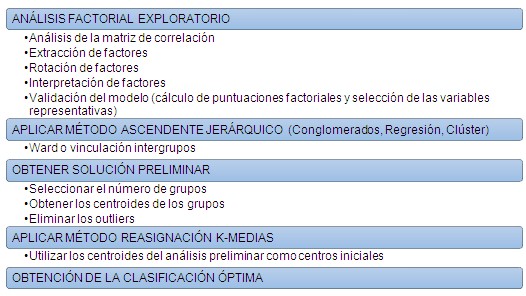 Las Técnicas de análisis utilizadas han sido básicas (medias y frecuencias), tabulación cruzada, análisis de la varianza, análisis factorial, segmentación (análisis clúster) y análisis discriminante (Ricolfe et al, 2008). El procedimiento permite realizar primero un análisis factorial exploratorio según la naturaleza que presentan los datos (Pardo & Del Campo, 2007) y luego una clasificación basada en un algoritmo mixto: clasificación jerárquica con el método de Ward y agregación alrededor de centros móviles (K-medias), considerado, generalmente, como el método más robusto disponible en el paquete estadístico SPSS (Lopes et al, 2010).