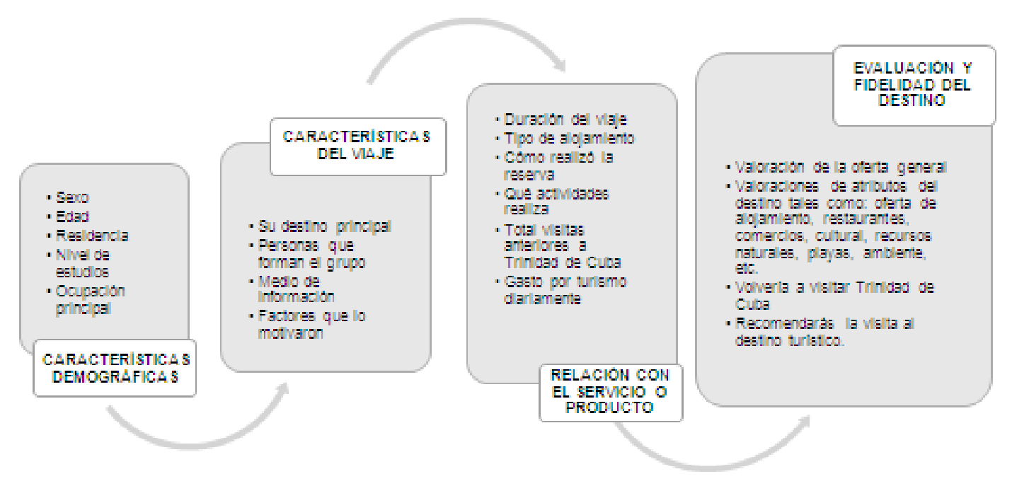 El trabajo de campo y de aplicación de la encuesta estructura por un cuestionario de 19 ítems basado en estudios previos (Collado et al, 2007;Molera & Albaladejo, 2007;Ricolfe et al, 2008; Jiménez & Vargas, 2009;García et al, 2011;Pesonen, 2014; Vázquez de la Torre et al, 2016; Agüera et al, 2017; Beltrán-Bueno & Parra-Meroño, 2017; Franco et al, 2017; García et al, 2017;Carvache-Franco et al, 2018;PradaTrigo et al, 2018)donde se pregunta acerca de factores que determinan la demanda, el perfil del cliente, de satisfacción y valoración de los productos y servicios turísticos del territorio. La estructura seguida en el cuestionario (ver diagrama 1) está dividido en cuatro bloques: (1) direccionado a las características demográficas; (2) las características del viaje, donde destacan los factores que motivaron su visita, (3) relacionado con el servicio o producto; y el (4) y último bloque a las evaluación y satisfacción, con el objetivo obtener información concerniente a la valoración de la oferta turística así como la satisfacción y fidelización de los turistas.