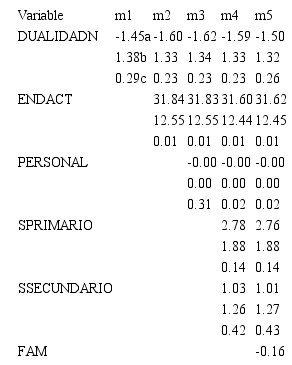 Los resultados obtenidos en este estudio, se recogen en esta sección, la cual el análisis parte para cada modelo planteado y posteriormente corroborar las hipótesis planteadas en esta investigación. La Tabla 1, 2 y 3 muestran diversos submodelos m1, m2, m3 m4 y M5 donde se puede observar el dinamismo de los coeficientes al ingresar una variable más en los mismos