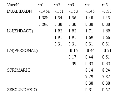 En el submodelo 5 se puede observar que al 5% de significancia la variable endeudamiento sobre activos y personal resultan significativas. Por otro lado, las variables Dualidad, sector primario, sector secundario y empresa familiar no son significativas para el modelo.