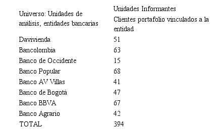 El universo poblacional de esta investigación estuvo constituido por las Entidades Bancarias de La Guajira. Como unidades informantes se definió: los clientes portafolio vinculados a las entidades bancarias de La Guajira, descritas como aquellas personas naturales que poseen por lo menos tres productos principales propios de una entidad bancaria: cuenta corriente, crédito rotativo y tarjeta de crédito. Los detalles de la misma se establecerán al inicio de los resultados.
