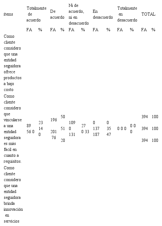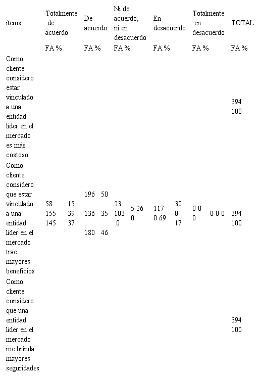 Como se observa en la tabla 2, el 50% de los clientes portafolio están de acuerdo con que estar vinculado a una entidad líder del mercado es más costoso, el 30% están en desacuerdo, el 15% se encuentran de totalmente acuerdo, y el 5% restante ni de acuerdo ni en desacuerdo. De igual manera, se evidencia que el 39% está totalmente de acuerdo con que el estar vinculado a una entidad líder del mercado genera más beneficios, el 35% están de acuerdo y el 26% ni de acuerdo ni en desacuerdo. Por último, se expone que el 46% están de acuerdo con que una entidad líder del mercado brinda mayores seguridades, el 37% están totalmente de acuerdo y el 17% de los encuestados se encuentra en desacuerdo.