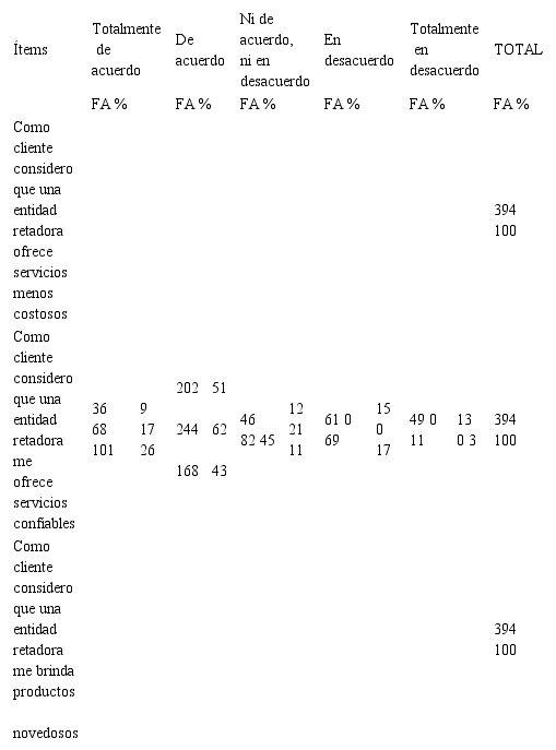 Como se muestra en la tabla 3, el 51% de los encuestados están de acuerdo con que el servicio que presta una entidad retadora en menos costoso, el 15% está en desacuerdo, el 13% está totalmente en desacuerdo, el 12% ni de acuerdo ni en desacuerdo y el 9% restante totalmente de acuerdo. El 62% se encuentra de acuerdo con que una entidad retadora ofrece servicios confiables, el 21% está ni de acuerdo ni en desacuerdo, y el 17% restante totalmente de acuerdo. Por último, se observa que el 43% de los clientes están de acuerdo con que una entidad retadora ofrece productos novedosos, 26% está totalmente de acuerdo, el 17% en desacuerdo, un 11% ni de acuerdo ni en desacuerdo y el 3% restante totalmente en desacuerdo.