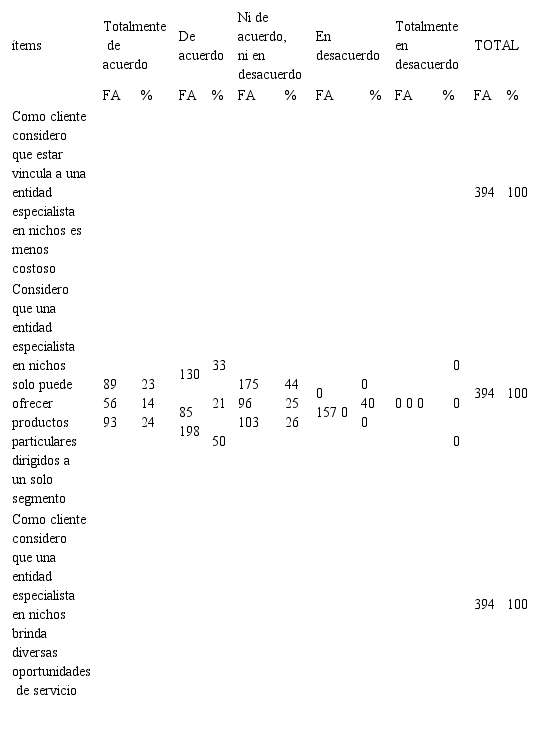 Como se observa en la Tabla 5, el 44% de los encuestados están ni de acuerdo ni en desacuerdo con que estar vincula a una entidad especialista en nichos es menos costoso, 33% está de acuerdo y el 23% totalmente de acuerdo. El 40% está en desacuerdo con que una entidad especialista en nichos solo puede ofrecer productos particulares dirigidos a un solo segmento, el 25% está ni de acuerdo ni en desacuerdo, 21% está de acuerdo y el 14% totalmente de acuerdo. El 50% de los clientes está de acuerdo con que una entidad especialista en nichos brinda diversas oportunidades de servicio 26% está en de acuerdo ni en desacuerdo y el 24% restante totalmente de acuerdo.