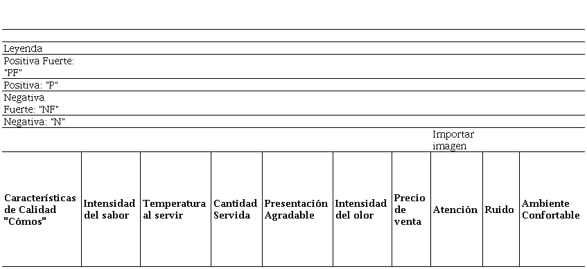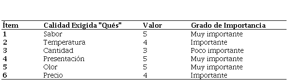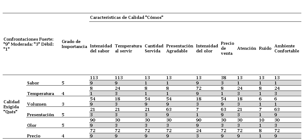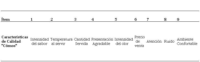 A partir de los ítems de calidad exigida puntuados se estableció, como se observa en el cuadro 2, las características de calidad con las que se espera dar respuesta a las necesidades y expectativas del cliente respecto al producto y servicio en la cafetería Black Mouth, estos son: intensidad del sabor, temperatura al servir, cantidad servida, presentación agradable, intensidad del olor, precio de venta, atención, ruido y ambiente confortable, todos ellos enfrentados en la etapa de establecimiento de la calidad proyectada y así determinar el grado de relación entre cada una ellas.