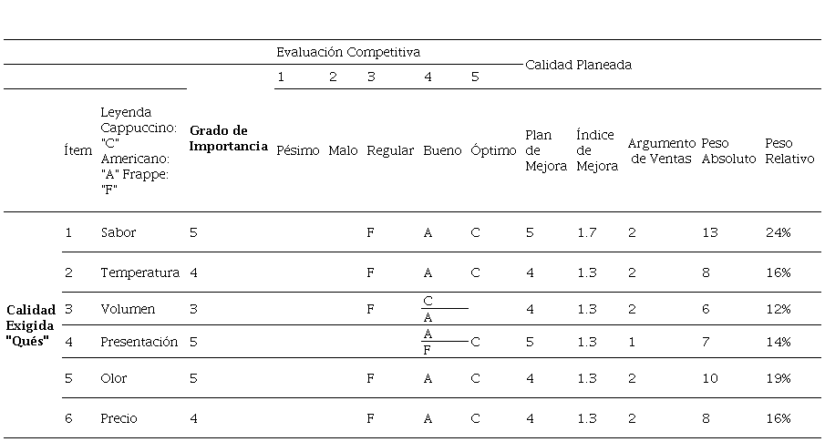 Con el desarrollo de la matriz de la calidad, principal herramienta del QFD, se identificó la voz del cliente (necesidades y expectativas) que luego fue evaluada competitivamente para determinar aquel producto que presenta un menor desempeño, siendo este el frappe, además permitió identificar los ítems de calidad exigida que tienen mayor representatividad: sabor (24 %), olor (19 %), temperatura (16%) y precio (16 %).
