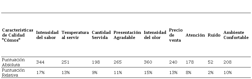 Asimismo, de acuerdo con la puntuación relativa se determinaron las características de calidad de mayor interés y atención correspondientes a: intensidad de sabor (17 %), intensidad de olor (15 %) , temperatura al servir(13 %) y precio (13 %), las cuales se deben potenciar prioritariamente para satisfacer las necesidades de los consumidores, estos valores se corroboran al observar los pesos relativos de la calidad planeada 24 %, 19 % ,16 % y 16 % correspondientes al sabor, olor, temperatura y precio, respectivamente. Sin embargo, no se deben dejar de lado aquellas cualidades exigidas y características que obtuvieron menores valores pues pueden crear conflictos en un futuro.