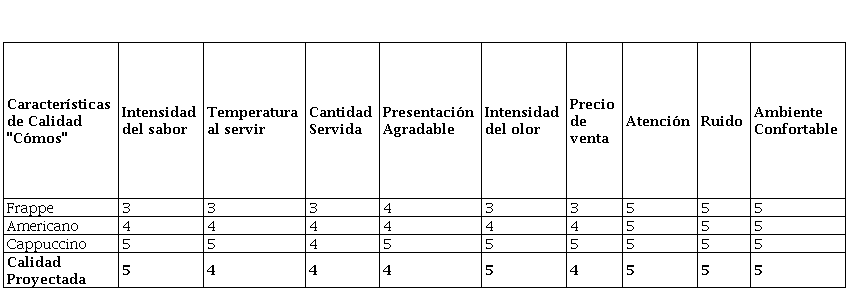 En el cuadro 7 se observa la calidad proyectada de cada una de las características de calidad de los tres tipos de café: Americano, Cappuccino y Frappe, evaluados a través del uso de la escala de Likert: Pésimo (1), Malo (2), Regular (3), bueno (4) y óptimo (5), Encontrando que aunque la importancia de los Cómo se modificó ligeramente, su orden de prioridad permanece casi igual.