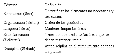 En lo que respecta al modelo 5´S, se destacan entre las cinco “S” aplicando esta metodología: Seiketsu, Shitsuke, Seiton, Seiri y Seiso. Estas buscan orientar la gestión de las empresas a la eliminación de los productos no necesarios, de manera que estos se organicen en base a un estándar disciplinario y constante, en conjunto con las condiciones óptimas del espacio físico (López, 2013). El método 5´S centra su objetivo en el orden de productos lo que influye en la gestión de stock, al pasar el tiempo apoya se evidencia la mejorar continua, eliminando en su totalidad los obstáculos de higiene y seguridad durante el proceso de producción eficiente, en el caso de las librerías y papelerías disminuir el tiempo de búsqueda de los productos (cuadro 1).