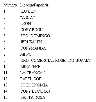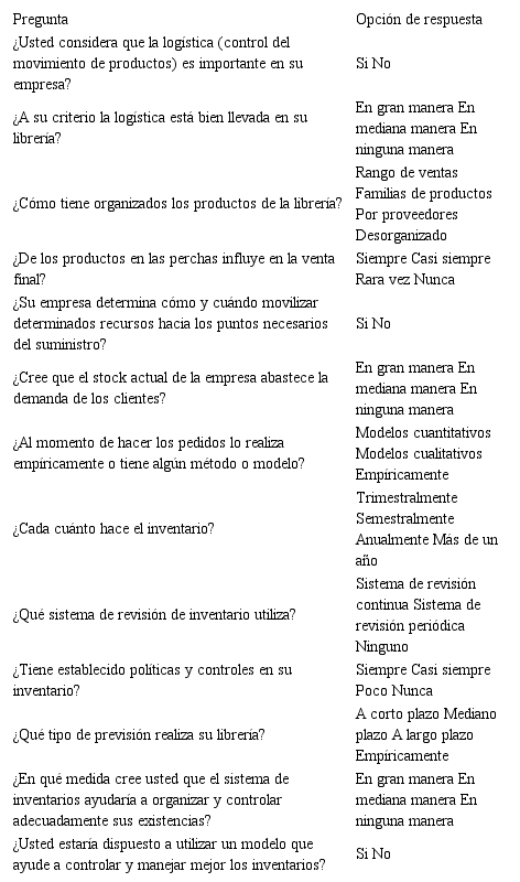 Para el estudio empírico, se selecciona una muestra a 15 librerías y papelerías pertenecientes a APLIPAT (Cuadro 2), mismas a las que se le aplica el instrumento detallado en el cuadro 3, obteniendo a partir de él información detallada para analizar el tema estudiado. Es de destacar que la encuesta aplicada, se divide en dos apartados; la primera sección con información básica de la institución (librería o papelería) y en la segunda sección donde se conoce las variables de estudio el control de stock como variable dependiente y la logística como variable independiente.