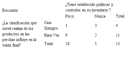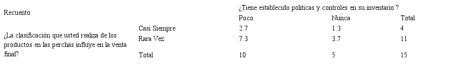 Al describir la correlación realizada en el caso de APLIPAT tomando en consideración las respuestas obtenidas en la encuesta se considera las frecuencias observadas (tabla 1) y esperadas, donde por medio de dos preguntas se pretende realizar una correlación y el análisis descriptivo buscando así determinar la incidencia de las variables consideradas. Por medio de la discusión de resultados se determina si la aplicación del Modelo Q y el Modelo 5´S aportaría a la gestión de stocks y la logística de las librerías y papelerías. En la tabla 2 se presentan las frecuencias observadas de la pregunta relacionada a las ventas.