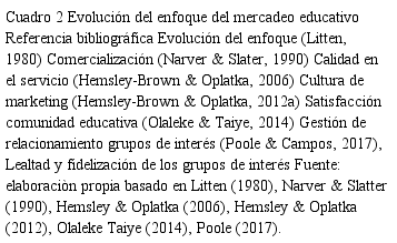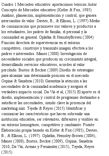 En este sentido, se inicia con la descripción de algunos autores que han aportado en la comprensión del mercadeo educativo y la manera como se evoluciona para ser pertinentes a los requerimientos del mercado (Cuadro 1).