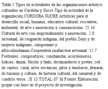 La composición al interior de estas organizaciones artístico culturales en Sucre y Córdoba, la constituyen mayormente fundaciones, seguidamente las asociaciones y finalmente corporaciones. La definición de su composición interna, son grupos familiares, grupos étnicos indígenas, resguardos, organizaciones comunitarias y organizaciones afro descendientes. En términos de año de funcionamiento la mayor representatividad es con más de cinco años; seguidos entre dos y cinco años y finalmente en menor proporción un año y 17%, menos de cinco años. El número de miembros afiliados son menos de 10, en un 53% de las instituciones; entre 10 y 50 el 29% de las entidades, y el 18% entre 50 y 100.