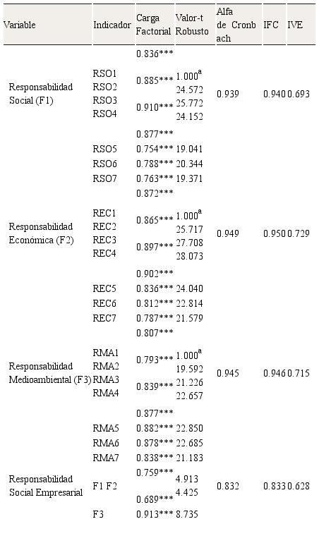 Los resultados de la aplicación del AFC se presentan en la Tabla 1 y sugieren que el modelo de medida proporciona un buen ajuste de los datos estadísticos (S-B X. = 2,529.499; gl = 714; p = 0.000; NFI = 0.817; NNFI = 0.848; CFI = 0.860; RMSEA = 0.074). Además la Tabla 1 muestra una alta consistencia interna de los constructos, en cada caso la Alfa de Cronbach excede el valor de 0.70 recomendado por