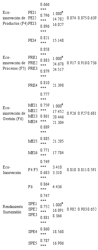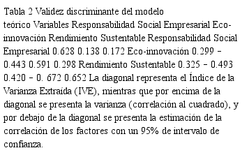 La validez discriminante del modelo teórico de la responsabilidad social empresarial, la eco-innovación y el rendimiento sustentable fueron medidos por medio de dos test, los cuales se presentan en la Tabla 2. En primer lugar, se presenta el test del intervalo de confianza(Anderson & Gerbing, 1988), el cual establece que con un intervalo de confianza del 95%, ninguno de los elementos individuales de los factores latentes de la matriz de correlación tiene el valor de 1. En segundo lugar, se presenta el test de la varianza extraída (Fornell & Larcker, 1981), el cual establece que la varianza extraída de cada par de constructos es inferior que su correspondiente IVE. Por lo tanto, de