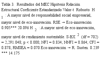 La Tabla 3 muestra los resultados obtenidos de la aplicación del MEC y, con respecto a la hipótesis H. los resultados obtenidos, β = 0.905 p < 0.001, indican que la responsabilidad social empresarial tienen efectos positivos significativos en la eco-innovación de las empresas manufactureras. En cuanto a la hipótesis H. los resultados obtenidos, β = 0.239 p < 0.001, indican que la eco-innovación tiene efectos positivos significativos en el rendimiento sustentable de las empresas manufactureras. En resumen, se puede corroborar la existencia de una relación positiva significativa entre la responsabilidad social empresarial, las actividades de la eco-innovación y el rendimiento sustentable.