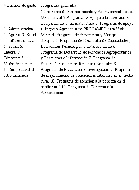 El PEC tiene 10 vertientes de gasto y 11 programas de acción (Cuadro 1). El Programa Especial Concurrente para el Desarrollo Rural Sustentable 2012-2018 (PEC) se encuentra alineado con el Plan Nacional de Desarrollo 2007 – 2012, la relación en mención se enuncia en el Cuadro 2 (PND, 2007).